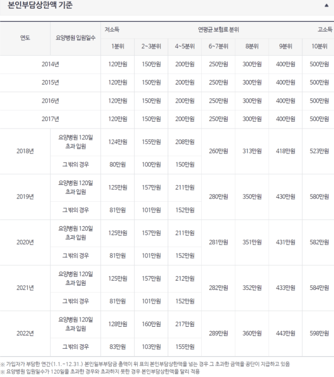 본인부담상한액 소득 수준은 가입자(세대별) 연평균 보험료에 따라 10분위로 구분(소득 수준은 다음해 8월에 결정되며 지역가입자는 세대별, 직장 피부양자는 직장 가입자 보험료 기준임)